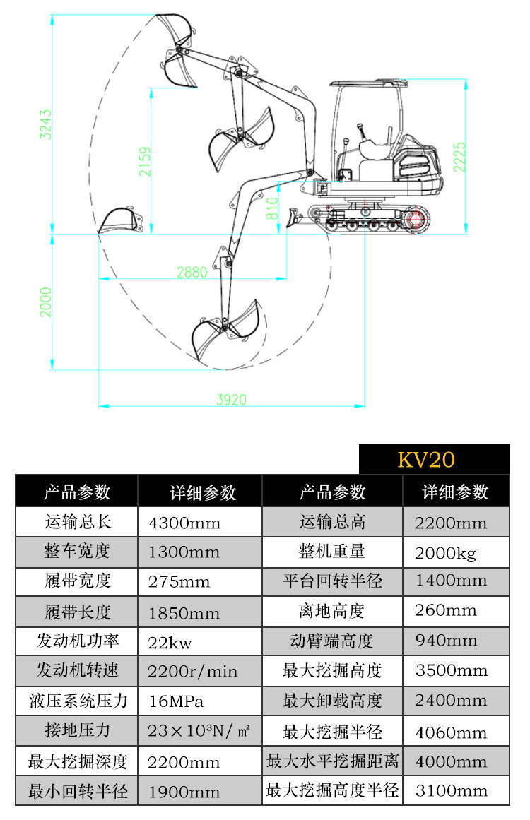 整機(jī)重量:2000kg履帶寬度:275mm發(fā)動(dòng)機(jī)功率:22kw